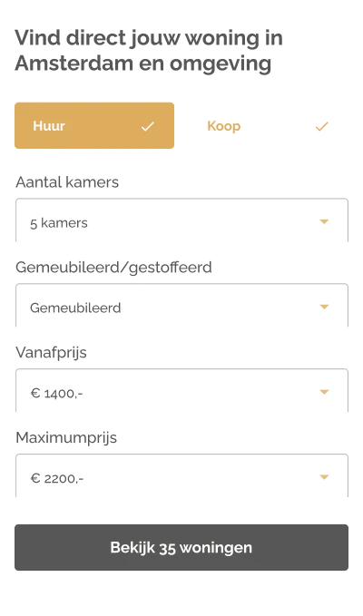 Onze focus ligt op de gebruiksvriendelijkheid van de website. Daarom bieden we de bezoeker op de homepage al de mogelijkheid om te filteren op belangrijke eisen zoals het aantal kamers en de prijs. De bezoeker kan direct op de kaart checken waar het passende aanbod zich bevindt.